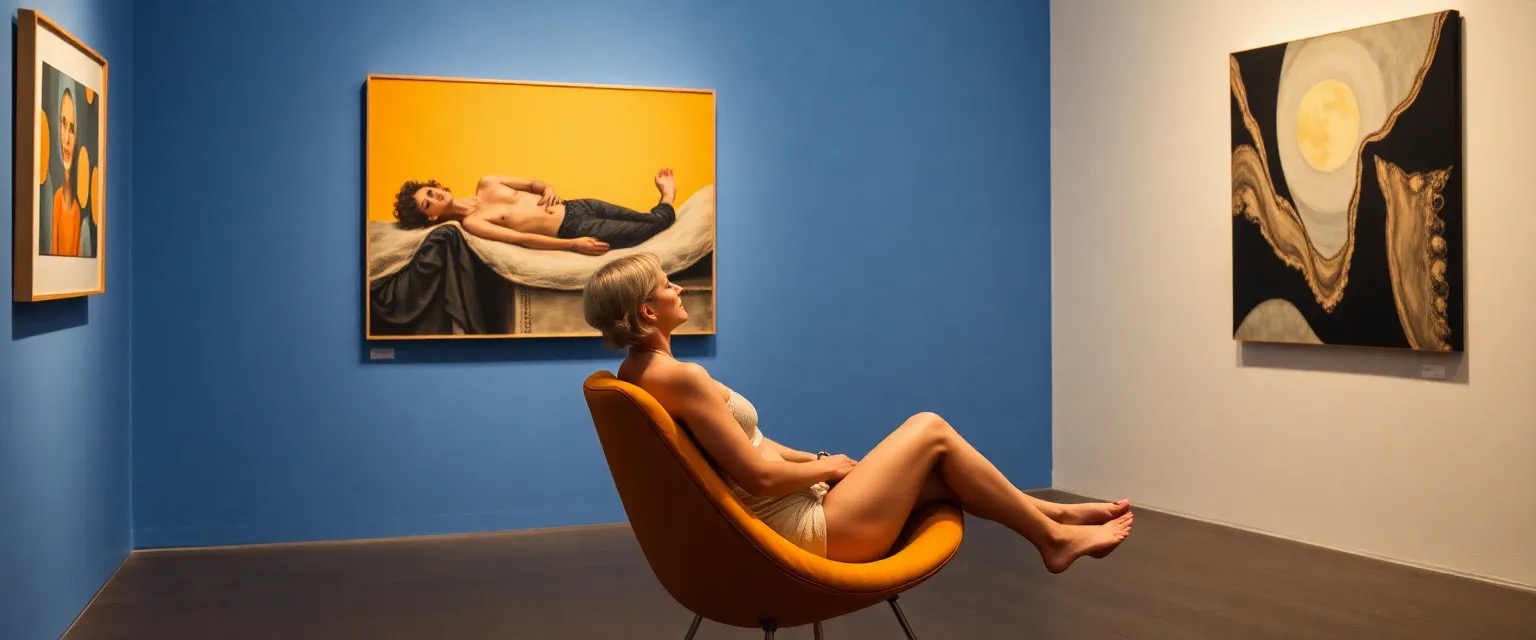 „ruhig in Farben“ „Ultrarealistische Szene in einer hellen Kunstgalerie: Eine Frau sitzt entspannt in einem beigen Designerstuhl, von hinten zu sehen, Blick auf farbintensive Gemälde an weißen Wänden. Warmer Holzfußboden, weiches Galerielicht, klare Komposition. Stimmung: ruhig, konzentriert, positiv.“