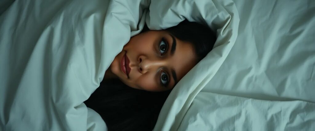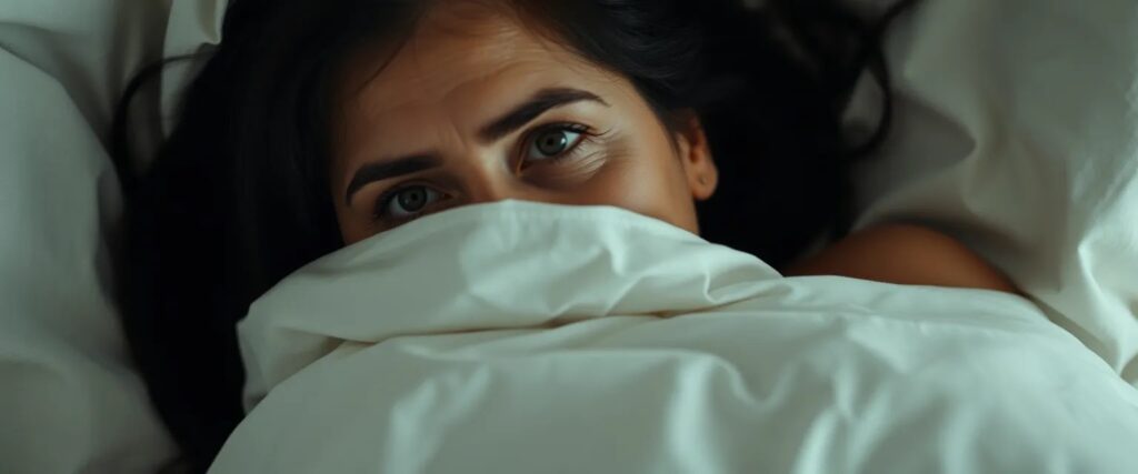 Une femme portugaise d’environ cinquante ans, aux longs cheveux noirs, est allongée sous une couverture dans un lit aux draps blancs légèrement froissés. Seul son visage, et peut-être une épaule, dépassent de la couverture. Ses yeux sont sombres, éveillés, pénétrants – elle me regarde et me parle doucement. Sa voix est calme, presque un murmure, pleine de proximité et de quelque chose d’inexplicable. Moi seul peux la voir, moi seul peux l’entendre. La pièce est feutrée, une lumière douce traverse les rideaux comme si le temps s’était arrêté. Il y a en elle quelque chose de pas tout à fait réel – ou peut-être est-ce moi. Elle est là, chaude, cachée, et pourtant elle parle directement à quelque chose en moi qui se tait depuis longtemps.