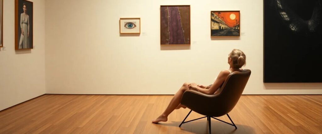 Eine Frau sitzt entspannt in einem modernen Sessel in einer hellen Kunstgalerie. Sie ist barfuß, ihr Körper wirkt gelöst und völlig ruhig, während sie die Gemälde an der Wand betrachtet. Der Raum ist minimalistisch gestaltet: glatte weiße Wände, warmes Holzparkett, weiches Ausstellungslicht.