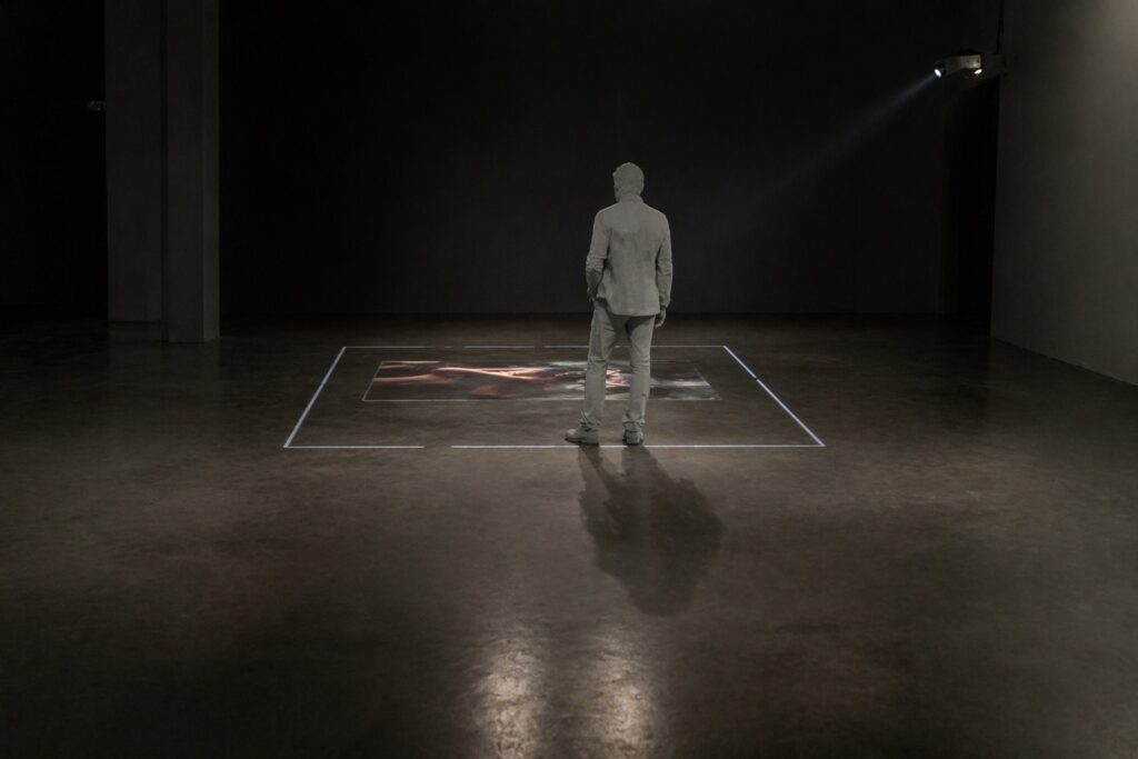 Ein Mann steht im Raum – nicht als Besucher, sondern als Maßstab. Vor ihm kein aufgehängtes Werk, sondern eine Fläche am Boden, klar begrenzt, beinahe wie ein Tatort der Erinnerung.