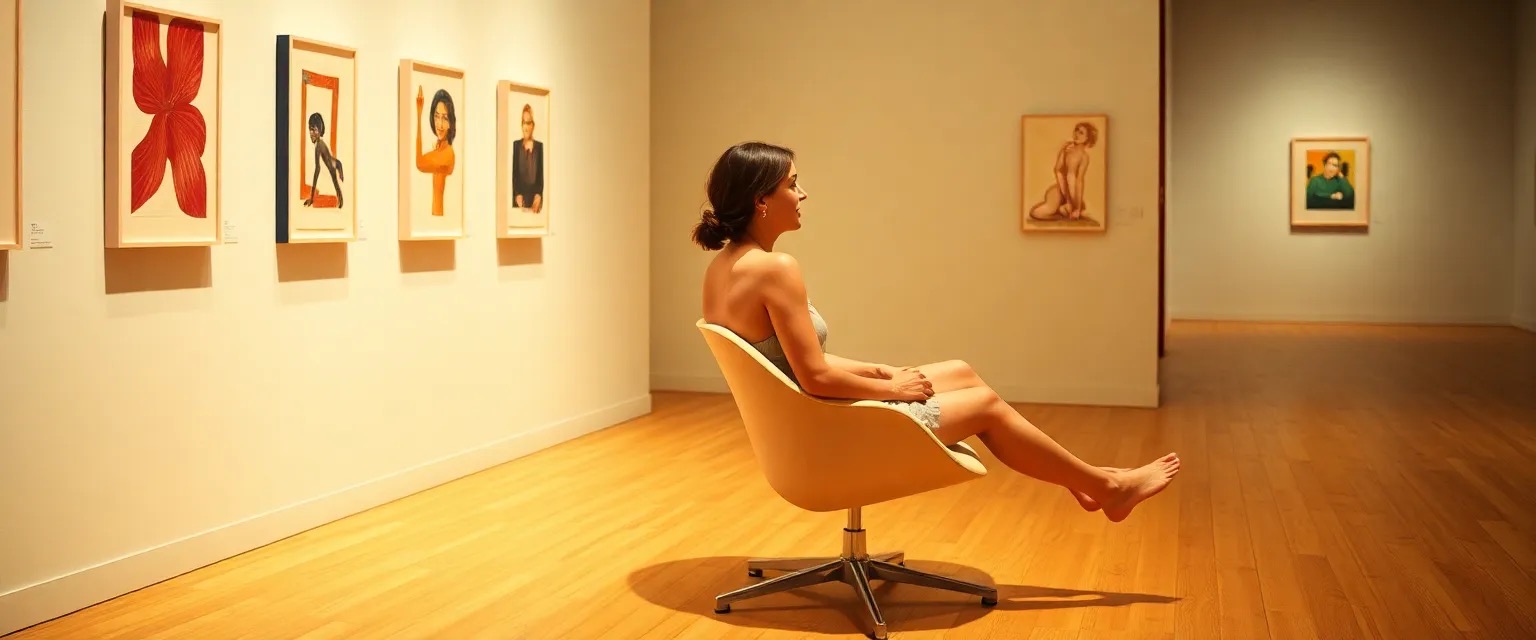 „leicht und ruhig“ „Ultrarealistische Szene in einer hellen Kunstgalerie: Eine Frau sitzt entspannt in einem gelben Designerstuhl, Beine ausgestreckt, ruhiger Blick nach vorn. Warme Holzböden, klare Wände, moderne Gemälde in kräftigem Gelb und Schwarz an der Wand. Weiches, warmes Galerielicht. Stimmung: leicht, still, positiv.“